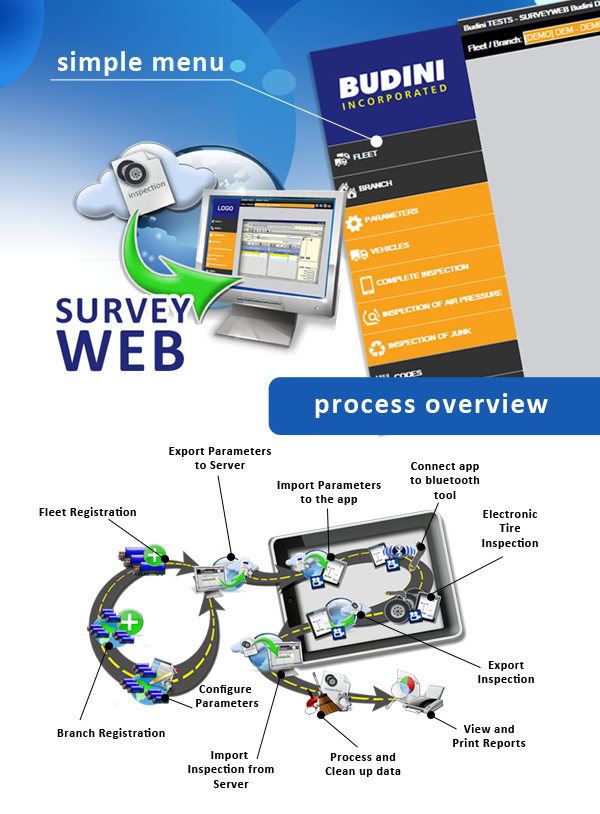 Using the Survey Web is much like "taking a picture" of the current situation of a Fleet's tires with a digital camera - You don't have to wait for the film to develop! This system is designed to inspect and analyze a Fleet's tires in a very fast and accurate manner. By performing an electronic tire inspection and processing it against a fully automated analysis that occurs immediately after collecting the data enable analytical reports that can be viewed or printed while vehicles or scrapped tires are still available and in time for someone to take the necessary preventive and corrective actions.